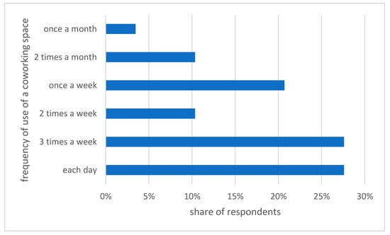 Less than one third (28%) of the respondents indicate that they are using coworking spaces each day. The same amount of people state that they are using the coworking space 3 days a week. Nearly one third (31%) of people are using coworking spaces 1 or 2 times a week. And 14% are using a coworking space 1 or times in a month (n = 29) (Figure 2).
