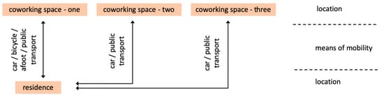 Some tenants of coworking spaces are traveling around and visit different coworking spaces at more than 150 km distance from their residence. Nearly a quarter of the respondents are using two coworking spaces, some are using up to five coworking spaces. Some are switching between commuting by car, bicycle or afoot, even if this doubles or triples their commuting time. It can be assumed that the traveling means depends on weather conditions []. Some of the tenants are using two or more coworking spaces, one close to their residence and another one in larger towns (Figure 4). The point shown in Figure 4 is that people may use different coworking spaces at different times, for different reasons and under different circumstances and related to the distance between residence and coworking space the respondents are using different modes of travel.