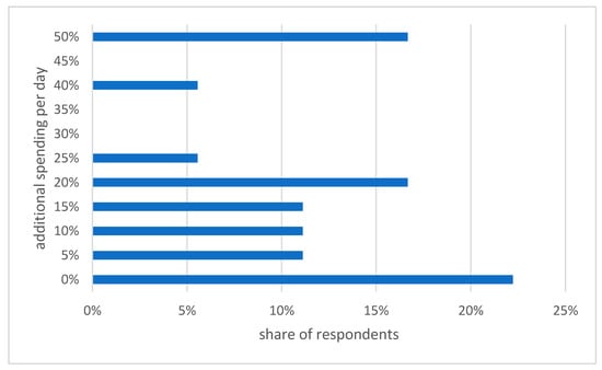 The most used services in the vicinity are bakeries, which 89% of the users visit. They spend 5 € per day at most, although some (19%) spend more than 5 € in bakeries. 67% are visiting restaurants or taverns and spend there up to 5 € (22%), from 6 to 10 € (44%) and up to 20 € (33%) per day. 56% of the tenants are going to supermarkets/grocery stores and spend there 20 to 30 € (10%), 10 to 20 € (26%) or up to 10 € (64%) each day. 29.6% of the tenants are going to kiosks, all of them spent less than 5 € each day. Small quantities (4%) are using laundries, childcare, post office and medical practices in the vicinity of the coworking space. Single named are e.g., fishmonger, town hall or drugstore (n = 23).