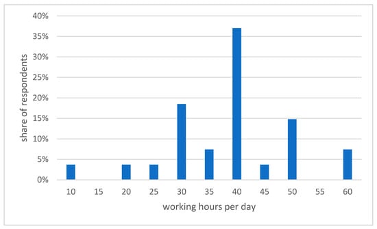 The largest group (41%) of the coworkers have between 37 up to 40 regular working hours, which corresponds to regular full employment hours in the frame of the German Working Time Act []. A group of 20% are regular working between 10 and 30 hours, which indicates a part time employment []. Out of this group a majority of more than 60% is working 30 hours per week, some only work 10 hours per week. Indicated by the reduced working hours, it could be assumed that this group of workforce is occupied by other things, like childcare, care of relatives or they have only a part-time position []. At the other end of the scale are a group of workers (22%) that state to work regular 50 to 60 hours per week. Considering the Working Time Act [], this must be a group of freelancers or entrepreneurs (n = 27) (Figure 6).