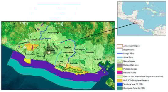 The study area is Jaltepeque-Bajo Lempa (Jaltepeque from now on), located in the south-central coastal plain of El Salvador, between the Jiboa (west) and the Lempa (east) rivers (Figure 1). The area, with a size of 49,454 ha, is a NPA listed as a Conservation Area (groups of NPAs and the territories that serve as nexus, according to the environmental legislation of El Salvador) and a Ramsar Site, since 2011 (“Jaltepeque Complex”, the second biggest brackish water area and intertidal forested wetland in El Salvador). Jaltepeque borders the Biosphere Reserve and Ramsar Site “Jiquilisco Bay”. The general morphology of Jaltepeque is one of a coastal plain whose maximum is 10 m above the sea level. Paired with its tropical savanna climate [39], this makes the mangrove thrive in the area, thus reaching an extension of 7599.43 hectares. Other ecosystems represented in the Conservation Area are mostly seasonal tropical forests whose extension has been reduced due to the expansion of crops. The mangrove acts as an important refuge for fauna, especially when it comes to the nesting of some turtles classified as in critical danger by the IUCN.