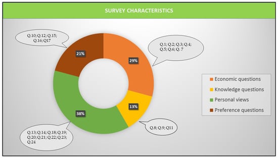 The quantitative data obtained from the questionnaires performed to the local population were classified according to four categories, with different representation or relative weight (%) in the survey: personal views, knowledge, economic, and preference questions (Figure 2). From the completed questionnaires, we designed a matrix of 39 observations (people interviewed) × 24 variables (people’s answers to the questions Q1–Q24). The information thus obtained allowed us to carry out both a descriptive analysis of the socioeconomic profile of the respondents, by means of graphical tools (bar charts) of their predominant social and economic descriptors, and a typology of the main social actors, at local level [58].