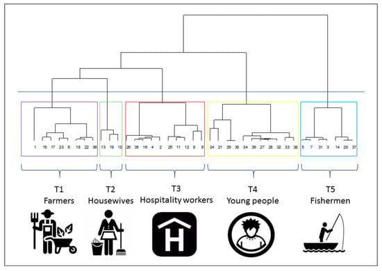 The results of the MCA and the subsequent hierarchical classification analysis on the factor coordinates of the first 7 ordination axes obtained, allowed us to identify five groups within the local population, with their occupation being the main difference between them (i.e., the most significant discriminant variable) (Figure 4). Thus, group T1 is characterized by male farmers over 60 years of age, while group T2 mainly consists of housewives above 60 years of age; the T3 group is made up of female hospitality workers, between the ages of 31 and 60 years, with basic knowledge about nature conservation. They know that they reside in a Ramsar site, and they also know the meaning of the BR protection category and express their desire to maintain it. The group T4 is characterized by young people under 30 years of age, who work in small companies and other commercial activities. They have secondary and higher education and prefer development options different from land conservation. Finally, the T5 group consists of men engaged in the fisheries sector, with an age range from 31 to 60 years. This social type is characterized by its lack of interest in and knowledge about nature conservation and sustainable development. The members of this group did not answer the question about their opinion on the potential establishment of a BR in Jaltepeque, since, as expressed in the interviews, they are unaware of this tool for environmental conservation and management. However, they explicitly expressed their lack of interest in the sustainable management of the study area, as well as in its tourism development.