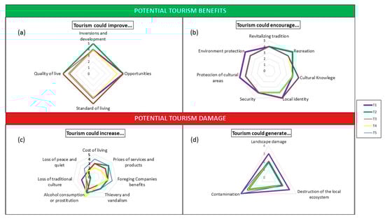 The groups corresponding to housewives (T2), hospitality sector (T3) and young people (T4), were closely in support of tourism development in the study area. All of them, with slight differences in some of the questions they were asked, considered that tourism could bring many positive social–ecological consequences (Figure 5a,b) and that the negative effects associated with increased tourism could not be very significant (Figure 5c,d).