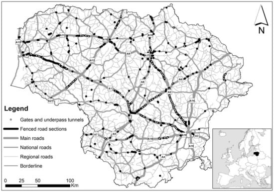 In 2017 only 3.78% of all roads were fenced in Lithuania. There were 1088 (total length 803.5 km) segments of wildlife fences, 680 of which (743.8 km) were implemented on main roads, 256 (48.6 km) on national regional roads, and 152 (11.1 km) on regional roads (Figure 1).