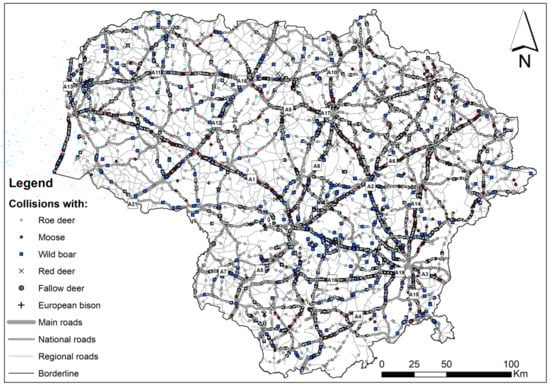 - Lithuanian Road Administration under the Ministry of Transport and Communications. Web Map of Animal-Vehicle Collision Distributions in Lithuania. Available online: http://gissrv.eismoinfo.lt/server/rest/services/LAKIS/su_gyvunais/MapServer?f=jsapi (accessed on 16 March 2020).