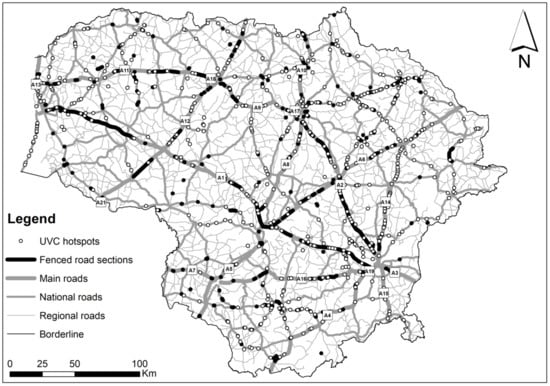 We analyzed UVCs in Lithuania on different categories of roads in the period 2002–2017, aiming to (i) map UVCs for each year, (ii) identify yearly UVC hotspots (short significant road segments where UVCs occurs more frequently than expected), and (iii) analyze UVCs and UVC hotspot relationships with annual average daily traffic (AADT) and the length of fenced road sections accounting for yearly changes.