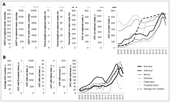 A pattern is regular in the UVC, UVC hotspot, and fencing locations on different categories of roads over time. During 2002–2017 in Lithuania the number of UVCs increased in all categories of roads. At the beginning of the period, both UVCs and fenced road sections were most common on main roads characterized by higher speed and traffic intensity. The same pattern was observed in Spain [45]. However, as of 2011, the numbers of both UVC and fenced road sections started to grow on roads characterized by lower speed and traffic intensity (Figure 4A). Similar to other countries [46,47] this UVC increase can be an effect of increasing wildlife populations in Lithuania [13].