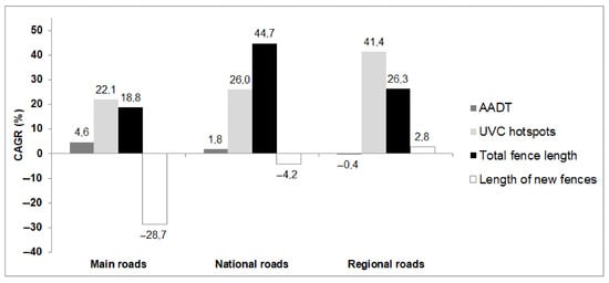 CAGR analysis revealed that AADT increased on main and national roads, while it decreased on regional roads (Figure 5, Table A1). UVC hotspot number, length, and average strength increased the most on regional roads (Table A3). The UVC hotspot average strength decreased on the main and regional roads (Table A3). The length of the new fences decreased the most on the main roads and increased on regional roads only (Table A4). The total length of fences increased the most on national roads (Figure 5). However, the share of new fences was decreased on the national and main roads (Figure 5, Table A1).