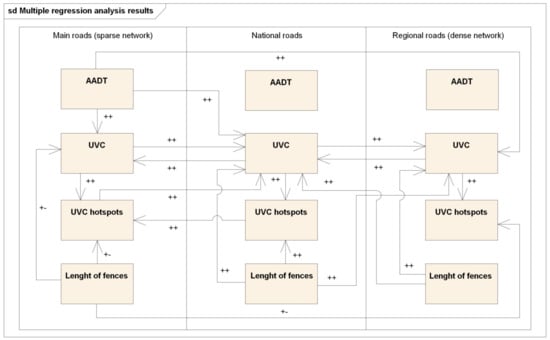 In order to simplify the interpretation of the MLR results (Table 1 and Table 2), we used the UML collaboration diagram (Figure 6), which showed only significant relationships. The vertical swim lanes in Figure 6 represent the different road categories. The dependent and independent variables were represented as rectangles. The first sign on the right (+ or –) adjacent to the line indicates changes within the source variables, while the second sign on the left (+ or –) indicates changes in the target variables (effect). Arrows show significant source–target relationships (Table 1 and Table 2). For instance, an increase (+) in fence length on main roads was significantly related to the decrease (–) of UVC and UVC hotspots on main roads (Table 2). The relationship lines are absent in cases where no significant relationship was found between variables (for instance, between AADT and UVC on national and regional roads).