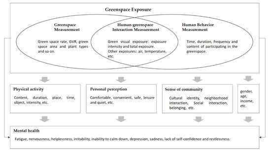 As mentioned above, the interaction between people and greenspace is conducive to health, which depends on continuous exposure to it, and some scholars call this greenspace exposure (GSE) [17,18]. The term GSE originated from medical scholars’ research on epidemics [18]. As the impact of greenspace on health becomes more and more prominent, GSE in the fields of ecology, environmental science, geography, and urban planning has received extensive attention and applications [19,20,21]. The research content mainly focuses on the impact of GSE on physiological diseases and mental diseases [22,23]. In 2018, Utrecht University held the NEEDS (Dynamic Urban Environmental Exposures on Depression and Suicide) conference to reveal the influence mechanism of GSE on anxiety and other mental diseases, and made a series of progresses [24].