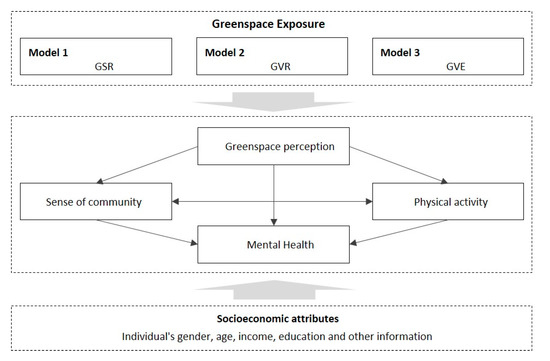 The impact of GSE on mental health has reached a broad consensus. Some scholars believe that part of the effects are positive [25], such as relieving occupational stress, improving depression, enhancing sleep, and establishing a positive attitude [26,27]. However, existing research also has some shortcomings. For example, the measurement methods for GSE are distribution, form, area, and accessibility, while the measurement methods for human participation in greenspace are time, location, frequency, etc., which leads to research often based on a single perspective of people or greenspace, while ignoring the interaction between them. Therefore, in order to reveal the influence mechanism of GSE on mental health more accurately, we propose different GSE measurement methods based on the perspective of human/greenspace interaction, and try to answer the following questions: (1) Do different GSE measurement methods (GSR, GVR, or GVE) lead to diverging results? (2) When the measurement method of GSE considers the actual reception of people, is the influence path more complex and diversified? (3) What are the influence mechanisms?