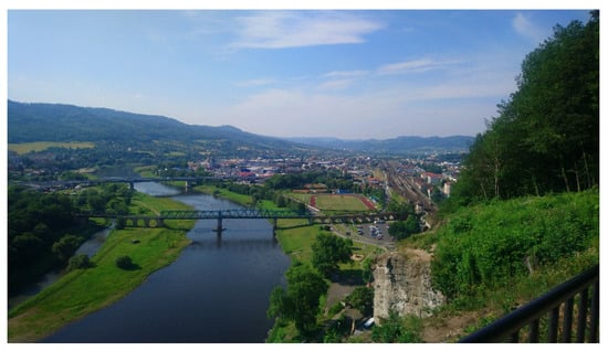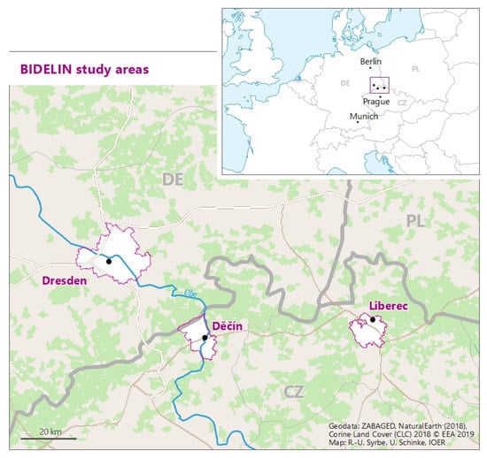 Dresden is the capital of the German federal state of Saxony. In 2018 (31 December) [49], its population was 554,649. Over 60% of the urban precincts, which extend 328.3 km², is made up of green space and forests such as the large Dresdener Heide. Visitors are also attracted by the wide meadows stretching along the banks of the River Elbe. Other typical characteristics of Dresden are the pleasant location of the city centre in a deep valley as well as the flood risk along the floodplain. Liberec is the capital of Liberec district. With 104,445 inhabitants (1 January 2019 [50]), it is the fifth biggest city in Czechia. Liberec is situated in a basin between the Jizera Mountains and the Jeschken Mountains, both over 1000 m high. About 40% of the 106.1 km² municipal area is covered by forests. Close to the centre, the Harcov reservoir is the green heart of the city. The Czech city of Děčín has 48,809 inhabitants (1 January 2019 [50]). With a municipal area of 117.7 km², it lies on the banks of the River Elbe, about 60 kilometres upstream from Dresden. Děčín is characterised by table mountains such as Kvaderberk, rock-climbing areas, a beautiful castle and amazing views alongside the relatively steep-sided Elbe river valley at the entrance to the world-famous Elbe sandstone mountains [40,51].