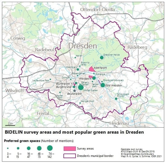 Survey areas in Dresden and the most popular green spaces (named at least three times in an open question) (source: authors’ elaboration).