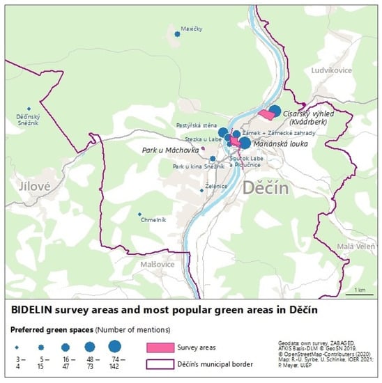 Survey areas in Děčín and the most popular green areas (named at least three times in an open question) (source: authors’ elaboration).