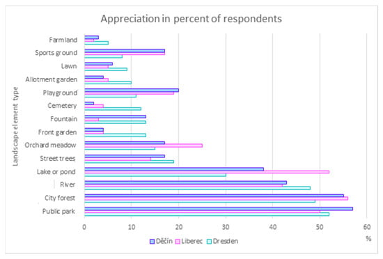 In the survey, we asked for a general appreciation of 14 landscape types or their features in addition to the specific sites where the interviews took place. The highest rated landscape types were different in the three cities (Table 6): in Liberec, urban forests were preferred (56% of respondents) to public parks (50 %). This order was reversed in Dresden (public parks: 52%, urban forests: 49%) and Děčín (public parks: 57%, urban forests: 55%). The same applies to rivers and streams, lakes, ponds and reservoirs, respectively. In Liberec, lakes, ponds and reservoirs were more popular (53%) than rivers and streams (40%), whereas in Dresden and Děčín, 48 and 43% of respondents, respectively, chose rivers and streams as the preferred landscape element types (those preferring lakes/ponds: 30 and 39%, respectively). Regarding the types and features of green space with a medium popularity, it is noticeable that in Dresden, cemeteries, front gardens and allotments were rated more than twice as often as in the Czech cities, while playgrounds and sports facilities were mentioned about twice as frequently in Czechia as in Germany. In Liberec, fountains were much less preferred as green elements than in the other two cities by a factor of approximately four.