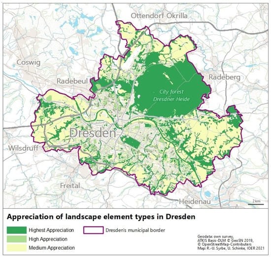 The chart in Figure 8 compares the level of appreciation of green space in the three cities. Based on these results, respective landscape elements can be identified for each city to help pinpoint potential forms of urban green space that are desired by the population and, thus, could boost the ecosystem service of recreation. Depending on the quality of each individual site, this does not lead to a map of actual services but rather the spatial potential for such an enhancement (see Figure 9 for a map of the different green elements and their appreciation in Dresden).