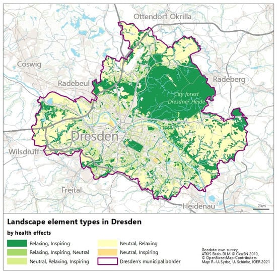 Landscape elements mapped by their health effects as a potential resource for recreation in Dresden (source: authors’ elaboration).