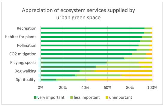 While the products of provisioning ES can be transported into cities, regulating and cultural ES generally have to be supplied close to or even within cities. The respondents to our survey spend their leisure time in urban green because they know that this improves their health. The most popular ecosystem services in our three cities were the possibility of recreation and better air quality (93% of the respondents in both cases), which are the two most important aids to good health. However, the next most valued ES were urban nature as providing habitats for plants, animals and, in particular, bees (respectively, for all cities: 90, 89 and 88%), which promote a sense of well-being (and, thus, also mental health). This is in line with [53], who found that “bird species richness is positively related to life-satisfaction across Europe, with a comparable effect to income”. The third most valued ES was microclimate regulation (86%), while all other benefits such as flood protection (75%) were lower in popularity. Green spaces were not particularly valued as sources of religious or spiritual inspiration, while activities such as dog walking were more often named as unimportant than important (the latter almost exclusively by the people with dog).