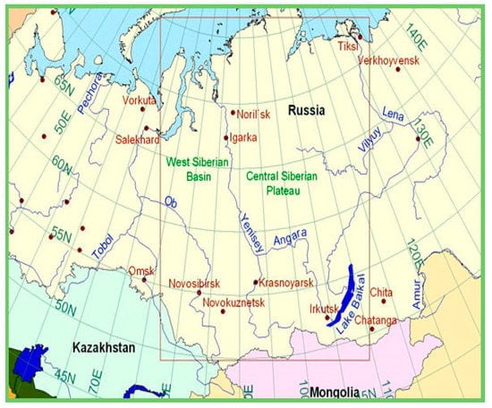 The Angara River is a major tributary of the Yenisei River. It flows rapidly north of Lake Baikal for about two-thirds of its 1779 km, before turning west at its confluence with the Yenisei River, which flows north to the Kara Sea, draining an area of about 2.58 million km2 along a 4102 km journey. The Yenisei’s flow rate in the Kara Sea fluctuates widely, averaging 19,800 m3/s, and up to 130,000 m3/s during the spring run-off [1]. The share of the Angara-Yenisei river system (AYRS) in the total inflow of rivers into the Kara Sea varies from 22.1% to 26.4%, which requires an assessment of the role of the Angara-Yenisei River system in Arctic water pollution [2,3,4,5,6,7,8,9,10].
