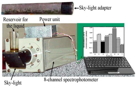 Field measurements were performed using an 8-channel universal pre-training spectrophotometer (US-8) to identify spectral images from 380 to 700 nm. US-8 software has algorithms for identifying and recognizing spectral images of the aquatic environment almost in real time. The main structure of the US-8 is shown in Figure 3. The US-8 can use two light sources including sunlight or artificial light (a halogen bulb, a tiny xenon pulse lamp, etc.). The use of sunlight requires a calibration process performed automatically for a period of 1 s. The in situ measurement procedure using the US-8 consists of immersing the sky-light adapter (1 m long) in the water environment. The measurements were made by vessels in areas of interest and are shown in Figure 2. The incoming light reaches the adapter and the analog-to-digital converter provides the relaxation coefficient as an indicator of water quality. The 35-channel spectrophotometer was used to analyze a water sample under laboratory conditions. In this case, US-8 software was used. For more accurate spectral monitoring results, the 128-channel spectroellipsometer was used for spectral analysis of water sampling. In all cases, the average measurement time was 0.5–1.0 s. The US-8 universality consists in its adaptation to the following three measurement modes: