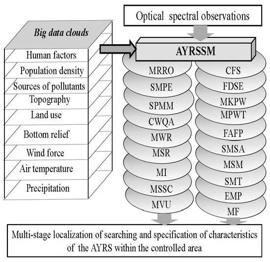 The results of this study show the adaptability of the developed information-modeling instrumental technology to monitoring the water quality of every river system, which can improve and increase the productivity of monitoring systems dedicated to water quality. The actual application of AYRSSM to control the water quality of other river systems requires a review of big data clouds, the spatial pixel structure, and the vegetation coverage. The fixed position of the US-8 optical spectral sensor at sites for the formation of spectral images of local water sampling provides an automatic monitoring regime. The implementation of this monitoring regime is the subject of the relevant scientific project.