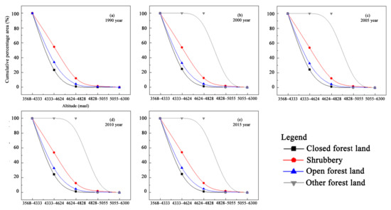 In addition, Figure 3 shows that, among the four forest landscapes, the area of shrubbery was the largest regardless of the elevation gradient or the slope gradient, followed by open forest land and closed forest land, whereas the smallest area constituted other forest land. This finding is related to the fact that shrub is generally more adaptable to harsh environments than arbor. In terms of time, from 1990 to 2015, the areas of closed forest land, shrubbery and open forest land manifested fluctuations within a narrow range.
