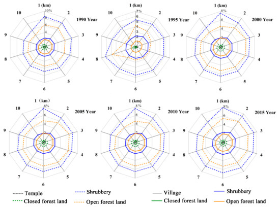 In order to further explore the influence of temples on the distribution of the three forest landscapes, we set up a buffer zone with the temple as the center and r as the radius (r1 = 1 km, r2 = 2 km..., r10 = 10 km), and calculated the proportions of the three forest landscapes in the buffer zone in the 6 periods of land use data from 1990 to 2015.