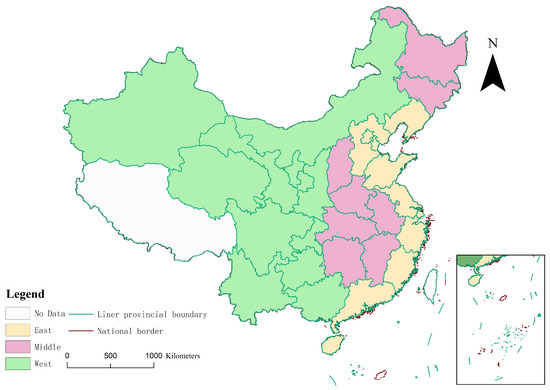In the early stage of reform and opening up, China, as a developing country, had a lower level of transportation infrastructure, which severely hampered economic growth. In the early 1980s, China proposed the development of transportation infrastructure as the top priority of the national economy, which led to the rapid development of transportation infrastructure in China. There are 34 provinces in China, including Taiwan and two special administrative regions (Hong Kong and Macau) and five autonomous regions (Xinjiang, Ningxia, Tibet, Guangxi, and Inner Mongolia). Due to the limitations of data acquisition in Tibet, Taiwan, Hong Kong, and Macau, this study selects the remaining 30 provinces (regions) of China as the study area (Figure 2) and constructs a spatial econometric model and panel threshold regression model to explore the spatial impacts of transportation infrastructure on ULUE in China during the period 2003–2018.
