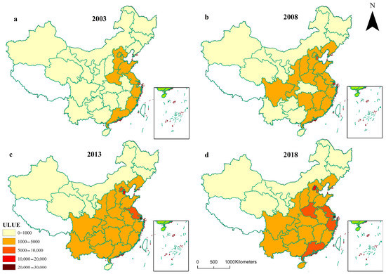 ULUE refers to the added value of secondary and tertiary industries per unit of land area [36]. In this study, we selected the ratio of output values of the secondary and tertiary industries to each provincial land area as the index of ULUE. To eliminate the influence of price factors, the GDP of each province has been adjusted in this study. The temporal and spatial changes in ULUE is shown as Figure 3. The ULUE calculating formula is as follows: