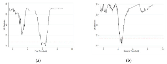 At the same time, the corresponding threshold value maximum likelihood estimation test charts we drew using Stata 15.1 software are shown in Figure 4. The lowest value in the figure is the threshold value in the likelihood ratio (LR). The likelihood ratio of the threshold variable is represented by a solid line, and the threshold values at the significance level of 5% are represented by a dashed line, which also verifies the existence of a double threshold. Finally, the panel threshold regression estimation results are reported in Table 7.