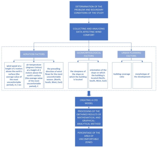 The research methods were aimed at determining the percentage of comfortable areas based on the ratio of the aeration regime and slope parameters, the existing data on the Arctic region, and the specifics of the implementation of urban planning activities. To obtain useful results, we developed the following methodological fluxogram of the research (Figure 2).