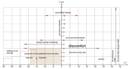 Perceptions of the surrounding thermal environment can be evaluated by an empirical method using the wind-chill index presented in the studies of Quayle and Steadman []. This index describes the combined effect of the temperature and wind speed parameters on the psychological and physical state of a person, which is described in detail in the works of Osczevski [,].