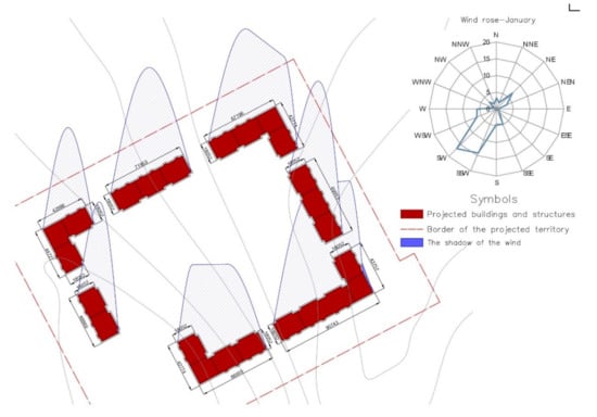 Theoretical research requires first collecting and analyzing data affecting wind comfort—Aeration, geomorphologic, and urban planning parameters as well as a building coverage ratio and area plan morphotype, for theoretical model. The main optimization parameter that was used to assess the planning configuration of a residential zone is the percentage of the area of the uncomfortable zone that was determined as the result of theoretical study using CFD analysis. The analysis of the climatic conditions of the Murmansk metro area enabled describing the main values of the initial data for further assessment of residential wind comfort (Figure 3).