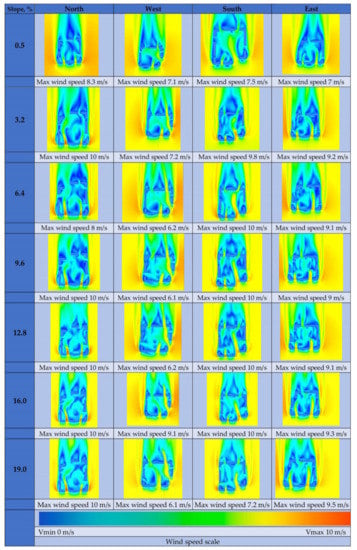 Studies have shown that within the range 13.2 to 19%, the change in the velocity fields is insignificant. Thus, the final matrices for determining the uncomfortable areas were made for slope values of 0.5%, 3.2%, 6.4%, 9.6%, 12.8%, and 19%.