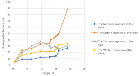 The results obtained indicate that the increase of the slope elevation at any exposure of the slope increases the percentage of uncomfortable areas.