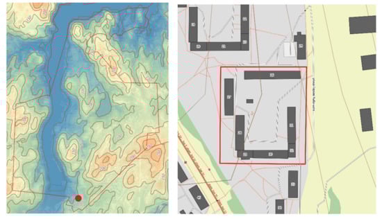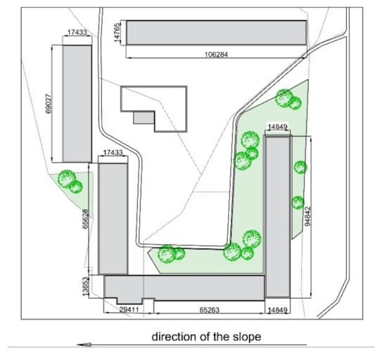 For the study, a site was taken with the same residential block plan pattern and density as in the theoretical study. The site is a perimeter building and has a western exposure and the slope is 13.6% (Figure 8). Climatic parameters are the same as for theoretical research: the average winter temperature in Murmansk is −18 °C which at a wind speed of 4 m/s or more will be uncomfortable for residents.