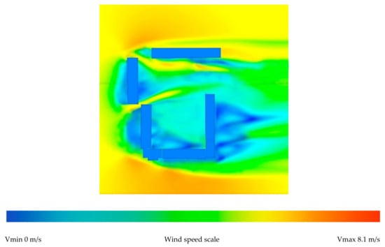 After obtaining the main parameters, CFD modeling was carried out. Figure 5 presents visual processing of the experimental data obtained using ANSYS Fluent software as velocity fields for various combinations of gradient and exposure of the slopes under the most uncomfortable prevailing southwestern wind direction. The speed scale shown in Figure 6 was used in the assessment. The speed scale indicates the speeds obtained because of changes in the direction, pressure, and speed of the wind. In the fields of velocities, the speed gradation is shown by the gradation of colors (Figure 6). The focus is on the adjoining space, which hosts are the main socially significant components of beautification—playgrounds, sports grounds, and places of quiet recreation.