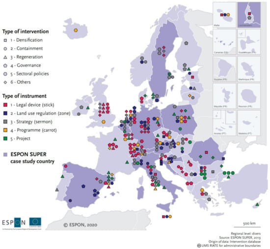 - Cotella, G.; Evers, D.; Janin Rivolin, U.; Solly, A.; Berisha, E. ESPON SUPER—Sustainable Urbanization and Land Use Practices in the European Regions. Annex 2—Evidence on Interventions; Version 06/11/2020; ESPON EGTC: Luxembourg, 2020. [Google Scholar]