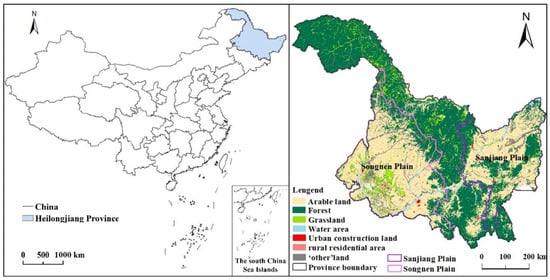 The geographical location of the Heilongjiang province and its land use in 2014.