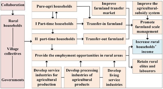 The main contribution of this study lies in the inclusion of different rural households and income structures into the same framework, allowing for a thorough sectional exploration of the impacts of farmland transfer. Further, this study has introduced the PSM method based on the counterfactual analysis framework, solving the "self-selection" issues related to rural households’ farmland transfer behaviors and the subsequent potential endogenous problems and selectivity bias, and the study provides a scientific basis to reasonably plan farmland-transfer guidance of different rural households. More specifically, the paths to increase rural households’ income are summed up (Figure 3), and the major three conclusions and policy implications that have been drawn are as follows: