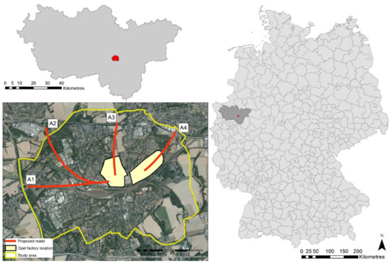 Location of the study area in Germany and the Ruhr area, and main features. Four alternative access roads to the GM/Opel European logistics centre are under discussion (A1, A2, A3 and A4). Satellite imagery: ESRI, DigitalGlobe, GeoEye, Earthstar Geographics, CNES/Airbus DS, USDA, USGS, AeroGRID, IGN, and the GIS User Community.