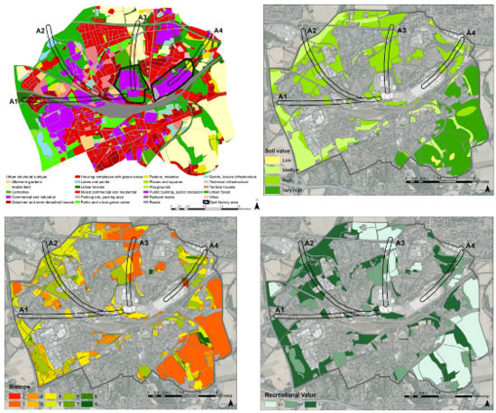 Urban structural subtypes in the study area (upper left). The areas of the European logistics centre for the distribution of spare car parts and the new industrial area are indicated with a black segmented line. The 50 m buffers of the four access roads are designated by the abbreviations A1, A2, A3 and A4. These buffers were used to calculate losses in the specific impacted areas. Soil values in open space (upper right). Biotopes values in open space (down left). Recreational values in open space (down right). Source: own elaboration and the assessment is based on information provided by the city of Bochum 2017 and Geological Survey NRW; satellite image as in Figure 1.
