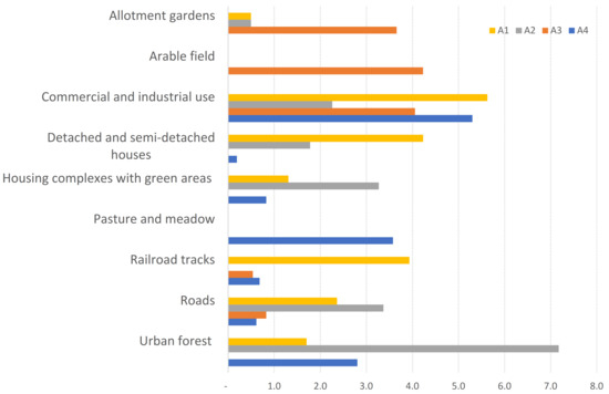 The USS most impacted by A1 was “commercial and industrial use”, accounting for 5.6 ha and 22.4% of the total impacted area. In the case of A2, the USS most impacted was “urban forest”, with 7.2 ha (28.3%) affected. A3 impacted 4.2 ha (25.5%) of “arable fields”, while A4 also impacted “commercial and industrial uses” at a similar amount as that of A1 at 5.6 ha (33.6%). In terms of the impact on the USSs classified as open space, A2 had the highest impact due to the 7.2 ha of urban forest affected. The second-highest impact occurred with A3, due to the impact on “allotment gardens” and “arable fields”. A4 impacted 3.6 ha of pastures and meadows, and, finally, A1 had less of an impact, with 1.7 ha of “urban forest” and 0.5 ha of “allotment gardens” affected.
