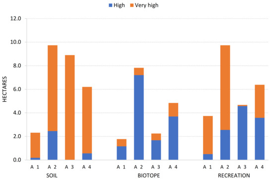 When the assessment included the quality of the impacted areas in terms of soil, biotope and recreation, the situation was similar to that described above. Figure 4 shows the highest and the lowest impacts of the access roads, according to the respective losses in terms of hectares, of high-quality soil, biotope and recreation. The most severe losses of good quality soil, biotope, and recreation were connected to A2, which had substantial impacts. The lowest impact for the three analyzed variables was found again in A1. High-quality soil will be impacted most by A3.
