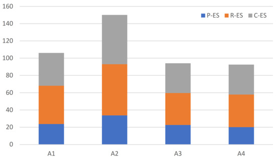 In this section, we assess the impacts on ES, quantifying the impact of each of the access options in terms of P-ES, R-ES and C-ES (Figure 5). Similar to the previous analysis, A2 had the highest impact. However, the situation regarding the lowest impact changed, with A4 having the lowest impact. Considering the impacts in terms of ES bundles, A4 showed the lowest impact for P-ES and the second-lowest impact for R-ES and C-ES.