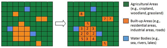 As illustrated in Figure 1, based on the raster land-use map with three land-use types (left), the number of joins between built-up areas and agricultural areas was calculated as the join counts value, and such values were assigned to each built-up area pixel (right). The assignment rules for built-up area cells were as follows: (1) take the built-up area cell as the central cell; (2) determine the number of agricultural area cells in the eight surrounding cells; (3) the assigned join counts value of the central cell is the number of agricultural area cells (i.e., the number of joins between the built-up area cells and the agricultural area cells). According to this procedure, the assigned join counts values of cells were between 0 and 8. For example, in the right-hand panel of Figure 1, there is a built-up cell with a value of 4. When this cell is used as the center cell, four of the eight surrounding cells are agricultural areas, one is a water body, and the other three are built-up areas. According to the assignment rules, the join counts value of the center cell is the number of agricultural land cells that surround it, which is 4. The join counts value indicates the frequency of the contiguity between built-up and agricultural areas, that is, the degree of the land-use mixture [8]. A higher join counts value indicates a higher degree of the land-use mixture around that pixel.