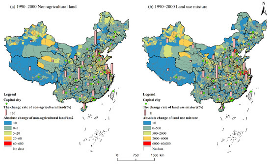 The spatiotemporal pattern of the changes in the non-agricultural land area (a) and land-use mixture (b) in 1990–2000.