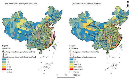 The spatiotemporal pattern of the changes in the non-agricultural land area (a) and land-use mixture (b) in 2000–2010.