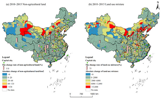 The spatiotemporal pattern of the changes in the non-agricultural land area (a) and land-use mixture (b) in 2010–2015.
